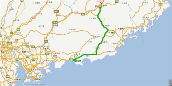 、海丽大道、甬莞高速、S335、S224、汕昆高速、梅龙高速、烟汕线,用时4小时9分钟,共236公里。