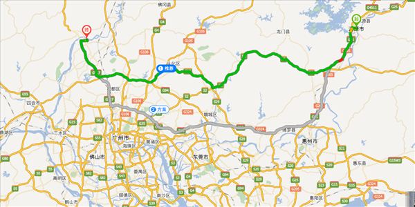 河源大道、长深高速、广河高速、S256、城鳌大道东、聚丰北路、乐广高速、清四公路,用时4小时9分钟,共225公里。