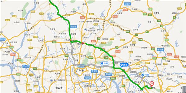广清高速、广州绕城高速、京港澳高速,用时2小时16分钟,共131公里。