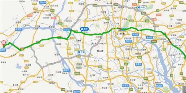 京港澳高速、广深高速、广州环城高速、广三高速、广昆高速,用时2小时35分钟,共156公里。