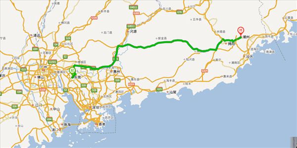 珠三角环线高速、济广高速、长深高速、汕湛高速、甬莞高速、潮惠高速、汕昆高速,用时4小时31分钟,共379公里。