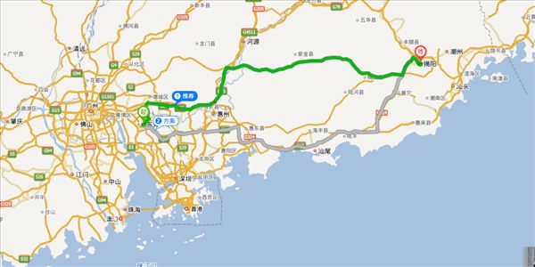 珠三角环线高速、济广高速、长深高速、汕湛高速、甬莞高速、潮惠高速,用时4小时13分钟,共350公里。