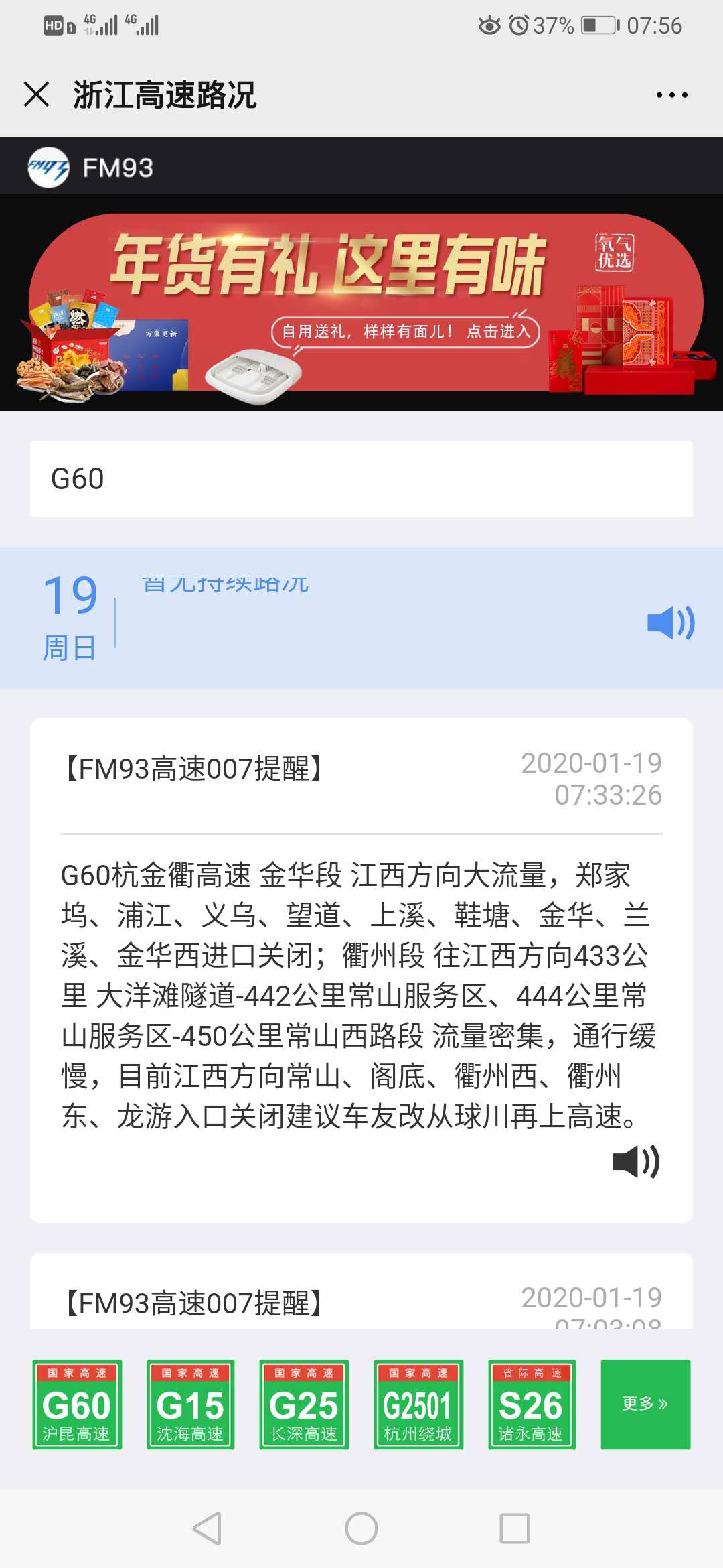 2020-01-19 06:31: 金华高速06时30分综合路况:1、G60沪昆(杭金衢)高速江西方向大流量,江西方向郑家坞、浦江、义乌、望道、上溪、鞋塘、兰溪进口关闭,金华、义乌、金华西、游埠衢江西方向通行正常。