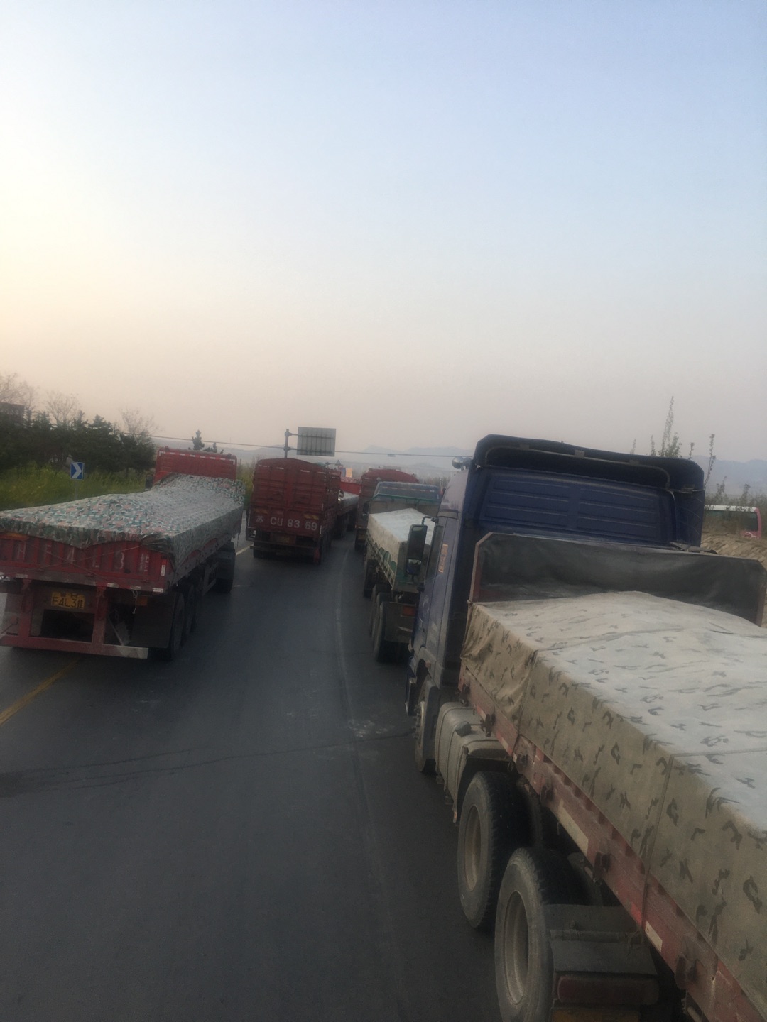 2020-04-07 06:32: [车友吐槽|日兰]泗水高速入口从昨晚管制开始到现在六点二十八分,文斯未动,前不见头后不见尾,天亮前到不了货还得被罚钱,运输太难做了…………